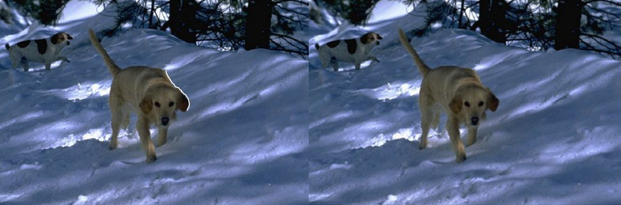 To fill any gaps between the new image and original, missing areas are identified and filled in using localized colour coordination.